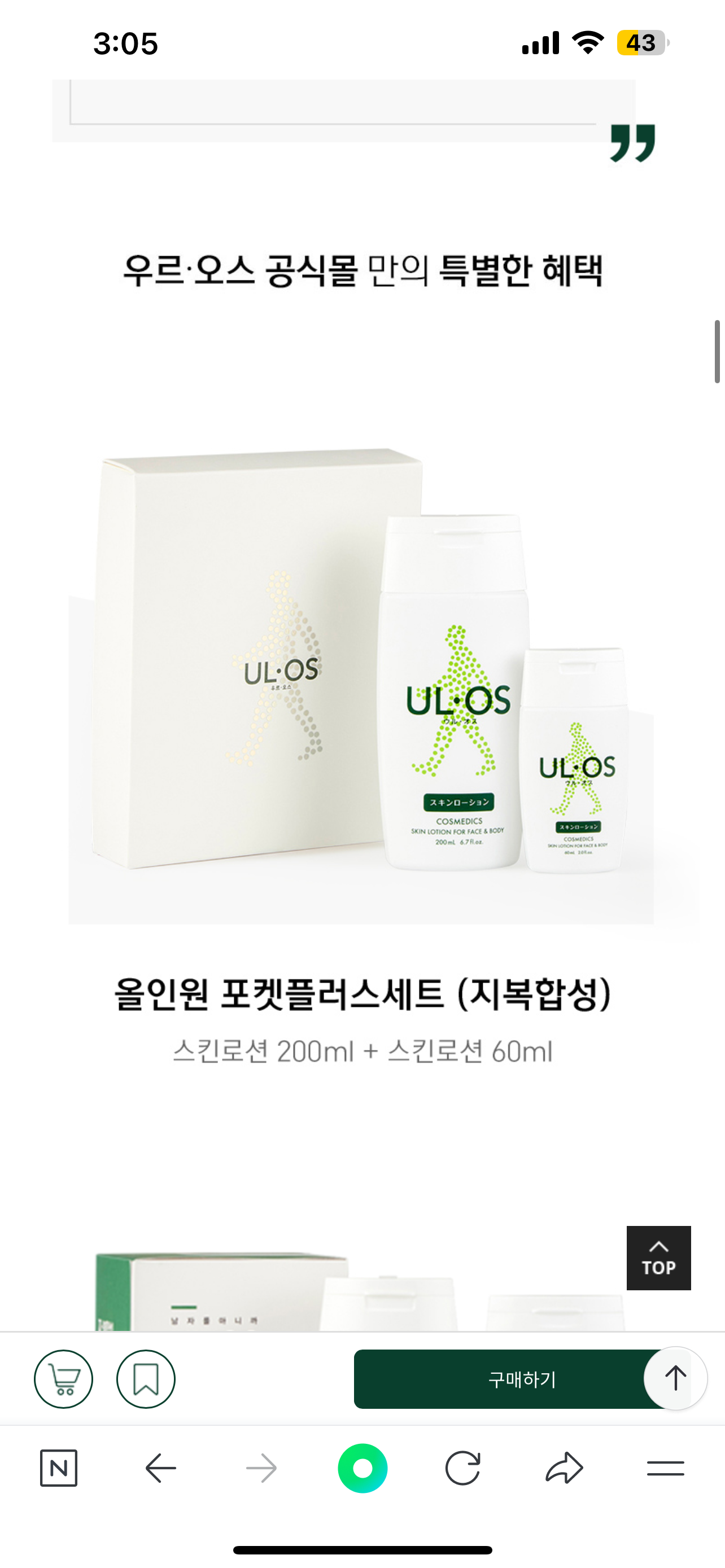 | 전성분 | 정제수, 에탄올, 펜틸렌글라이콜, 글리세린, 베타인, 피이지-6, 피이지-32, 아데노신포스페이트, 소듐하이드록사이드, 소듐다이라우미도글루타미드라이신, 피피지-6-데실테트라데세스-30, 알진, 시트릭애씨드, 소듐하이알루로네이트, 스타아니스열매/씨오일, 서양측백나무잎오일, 아틀라스시다나무껍질오일, 라반딘오일, 라임전초오일, 페퍼민트오일, 구주소나무잎오일, 로즈마리잎오일, 페녹시에탄올, 터펜틴, 리날룰 | ||